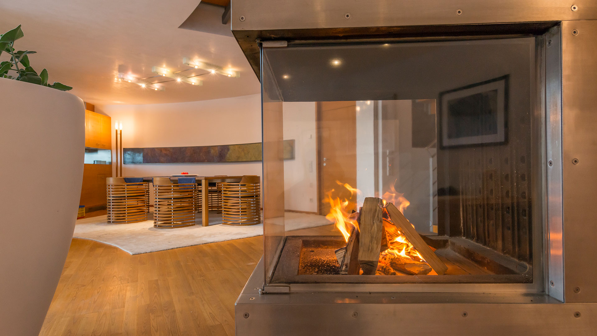 Across a cute little bridge lies the Turm Chalet, with a living area of some 500 m²/over 5380 sq ft spread over 4 floors. All levels are connected by a generous staircase located at the back. On the entrance floor are the bedrooms for children or guests, each en-suite and with their own generous terrace balcony. The level below features a spacious home office area; the broad glass frontage reveals views across the Upper Vinschgau all the way to the Swiss mountains, while the smaller windows frame the village of Tarsch like a still-life image of nature. One more level down you will find the main floor, where clear glass allows you to see through the kitchen to the dining space and generous seating area. This then leads either to the light-filled conservatory with its square carpet, or into the cosy living room.