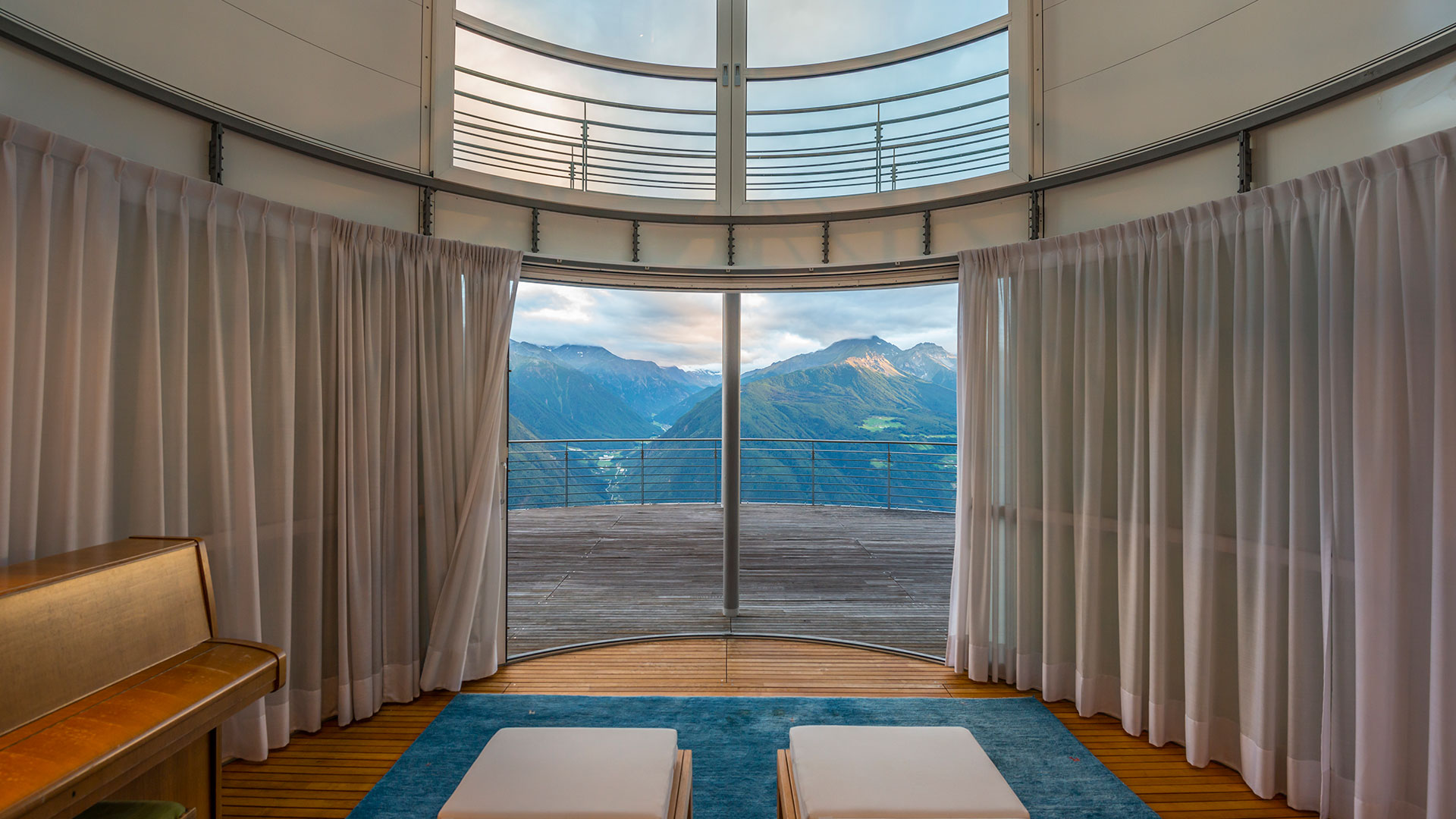 Die geschützten Balkone, welche den Zimmern vorgesetzt sind, haben durch die Wucht der Landschaft beinahe meditativen Charakter. Wie schwebend scheint der Besucher um sich zu blicken.